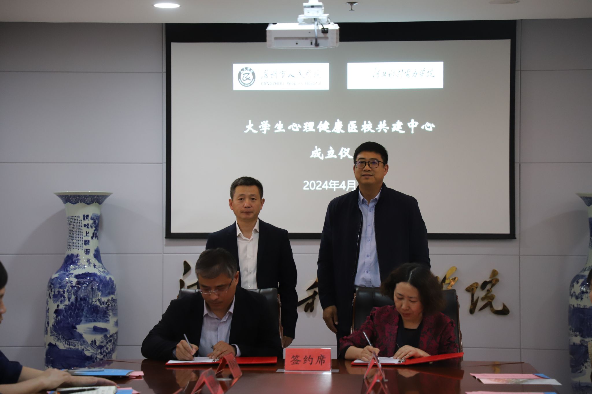 为进一步做好新时代大学生心理健康教育工作,积极构建心理健康教育医校合作新模式,4月23日下午,我校与沧州市人民医院“大学生心理健康医校共建中心”成立仪式在我校党委会议室隆重举行。我校党委副书记、校长王滨,副校长于振海、杨凯以及相关部门负责人,沧州市人民医院院长黄捷,党委委员刘宏达及相关科室负责人出席仪式。成立仪式上,杨凯与刘宏达签署了“大学生心理健康教育医校共建中心”项目合作协议书。王滨与黄捷共同为“...