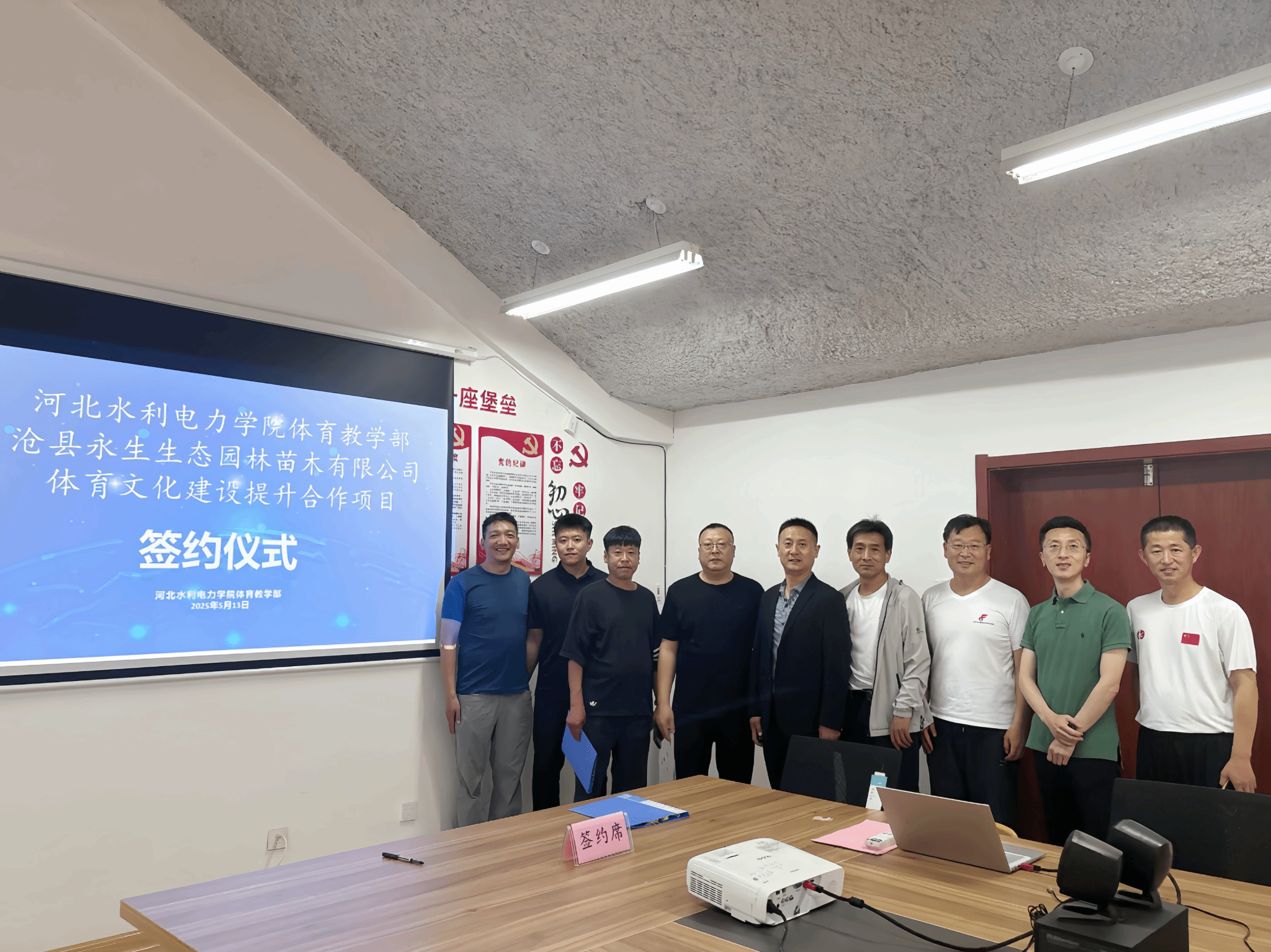 5月14日下午,体育教学部与沧县永生生态园林苗木有限公司体育文化建设提升合作项目签约仪式在体育教学部会议室举行。沧县永生生态园林苗木有限公司经理胡卫东,体育教学部主任周保国、项目负责人李振鹏及三个教研室主任出席了签约仪式。签约仪式上,周保国指出,此次合作是体育教学部深化校企融合的又一重要实践举措。体育教学部期待通过整合企业资源与高校专业优势,实现资源共享、优势互补,共同推动体育文化建设向更高水平发展。胡卫东表示,...