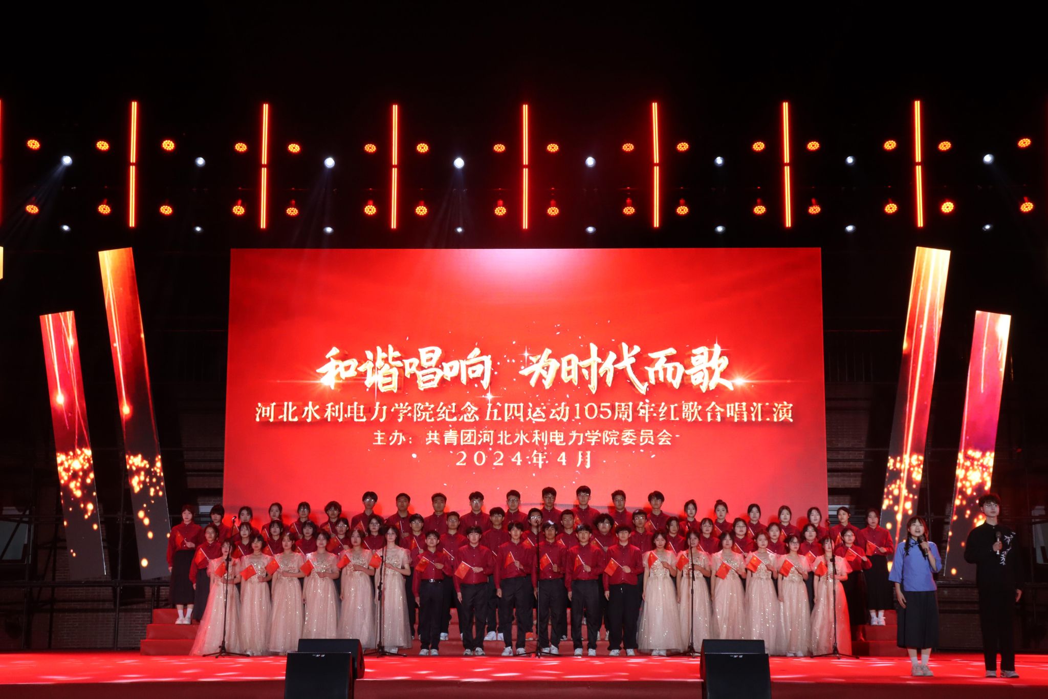 在热烈的掌声中,米兰体育官方网站2024年五四红歌汇演拉开帷幕。首先,张烨老师和大学生艺术团带来了精彩表演,青春洋溢的歌声为晚会营造了热烈的氛围。由水利工程系带来的《英雄赞歌》和《最可爱的人》点燃了现场观众的激情。《爱我中华》、《歌唱祖国》、《红旗飘飘》等一首首经典歌曲,将同学们的思绪拉回了一百多年前的青葱岁月,飞扬的歌声吟唱着难忘的岁月,熟悉的旋律演绎着时代的乐章。由交通工程系带来的歌曲《没有共产党就没有新中国》和《灯火里的中国》将现场气氛推向高潮。悠扬的旋律,洪亮的歌声,回放着岁月的记忆,引领着爱党爱国的豪情。