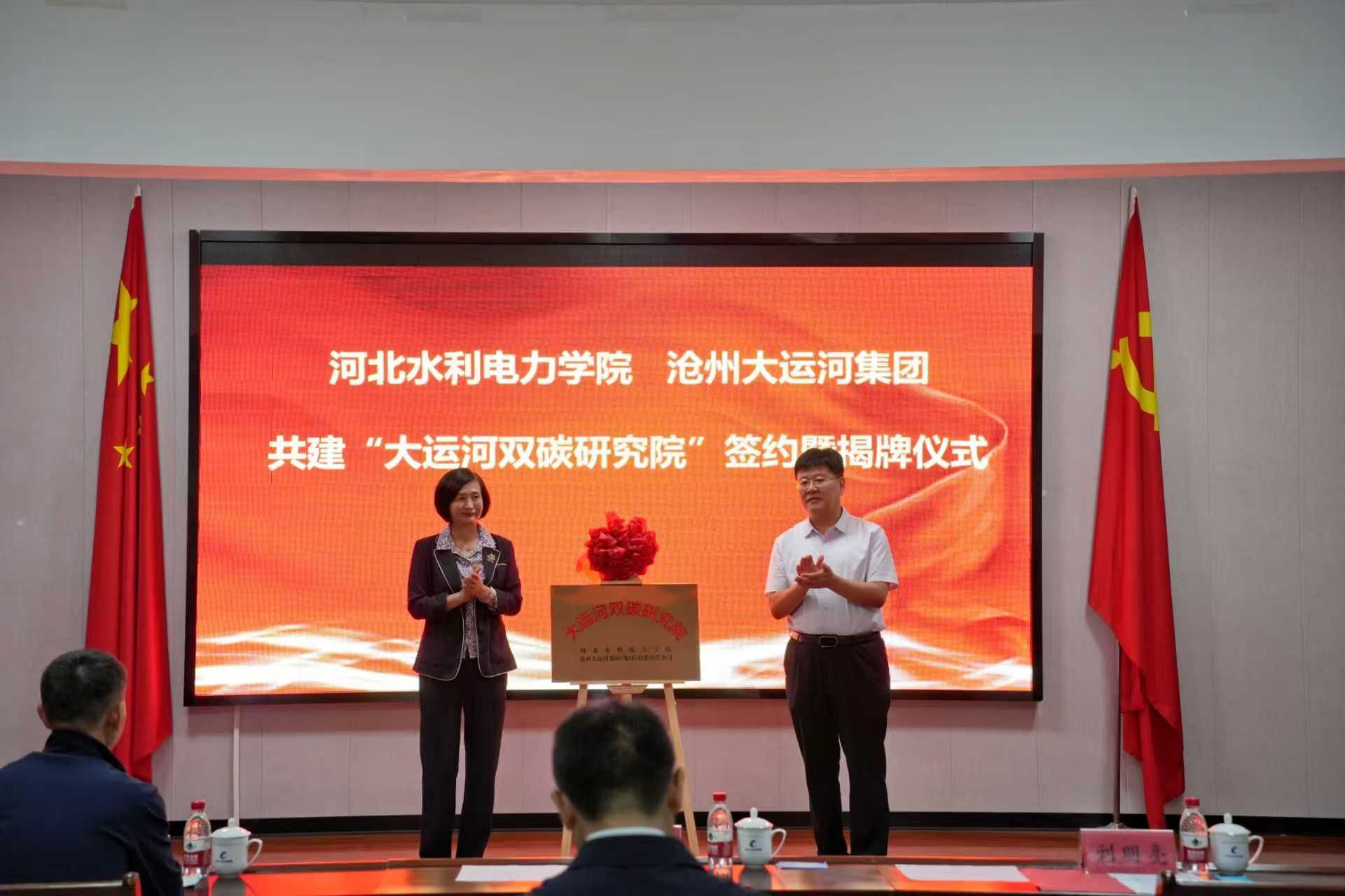 董志良与沧州大运河集团党委委员、副总经理李效顺代表合作双方签署了共建协议。冯艳玲与刘明亮为“大运河双碳研究院”揭牌。刘明亮在随后的致辞中强调,实现碳达峰、碳中和是党中央作出的重大战略部署,科技创新是实现这一目标的核心驱动力。市科技局将在政策、项目、资金等方面全力支持研究院建设,为其科研工作创造良好条件。