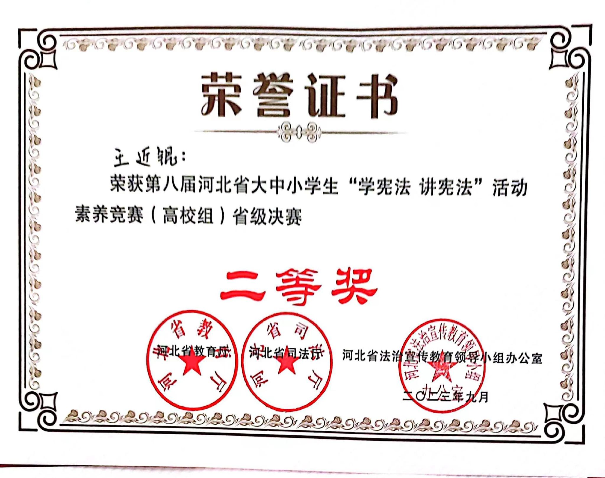 92627日,由省教育厅、省司法厅、省法治宣传教育领导小组办公室主办、河北师范大学承办的第届河北省学生“学宪法 讲宪法”大赛暨全国选拔赛在石家庄举行我校电气自动化系元阳烁和计算机系王近锟两位同学分别荣获“河北省大中小学生(大学组)演讲比赛省级决赛二等奖”“河北省大中小学生(大学组)素养竞赛省级决赛二等奖