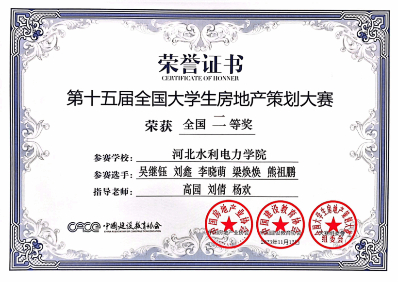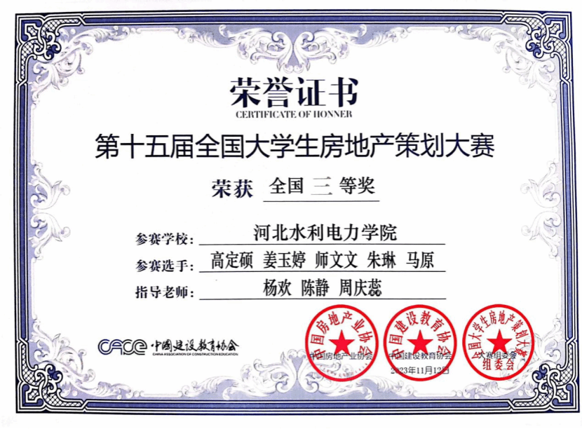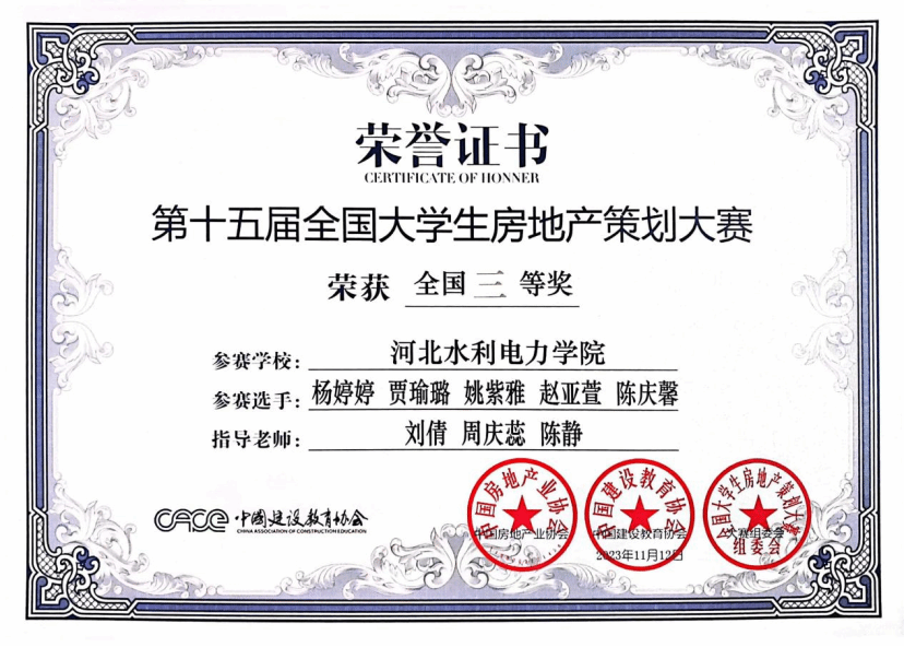 第十五届全国房地产策划大赛由中国房地产业协会指导、中国建设教育协会主办,比赛致力于进一步深化产教融合、校企合作,创新高校人才培养机制,促进教育链、人才链与产业链、创新链有机衔接,推动房地产行业“产、学、研、用”协同发展,提升大学生创新实践能力。在高园、刘倩、杨欢、陈静、周庆蕊等房地产教研室老师们的悉心指导下,由高定硕、吴继钰、杨婷婷等十五位同学组成的“星筠队”、“房地产加班队”、“0317小分队”三支队伍,历经三个多月的时间,发扬奋斗拼搏的精神,同中南大学、哈尔滨工业大学、四川大学等高校派出的近200支参赛队伍进行激烈角逐,最终,“房地产加班队”在乡村振兴赛道中喜获全国二等奖的佳绩,“星筠队”和“0317小分队”在文旅赛道中获得全国三等奖的佳绩。