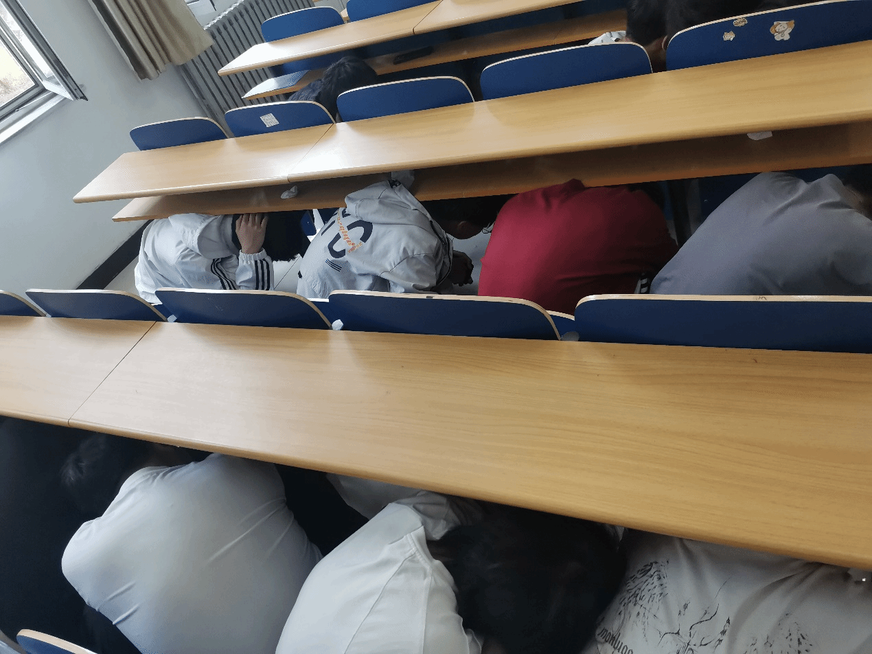 下午16:30,杨凯下达“演练开始”指令,广播系统播放警报及紧急避险指令,教室内的师生迅速做出反应,老师们立即指挥学生就近躲避,学生们迅速抱头、闭眼,躲在课桌下或课桌旁,蜷曲身体,降低身体重心,保护好头部、颈部,以避免被掉落的物品砸伤。