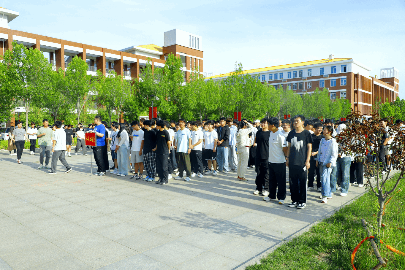 16:35,广播系统播放疏散逃生指令,辅导员、任课老师及安保人员指挥和组织学生按照预定的线路疏散到图书馆前广场。整个疏散过程中,师生们动作规范、配合默契,没有出现拥挤、推搡等现象。经清点人数,800名学生全部顺利疏散到广场,地震逃生疏散演练圆满结束。
